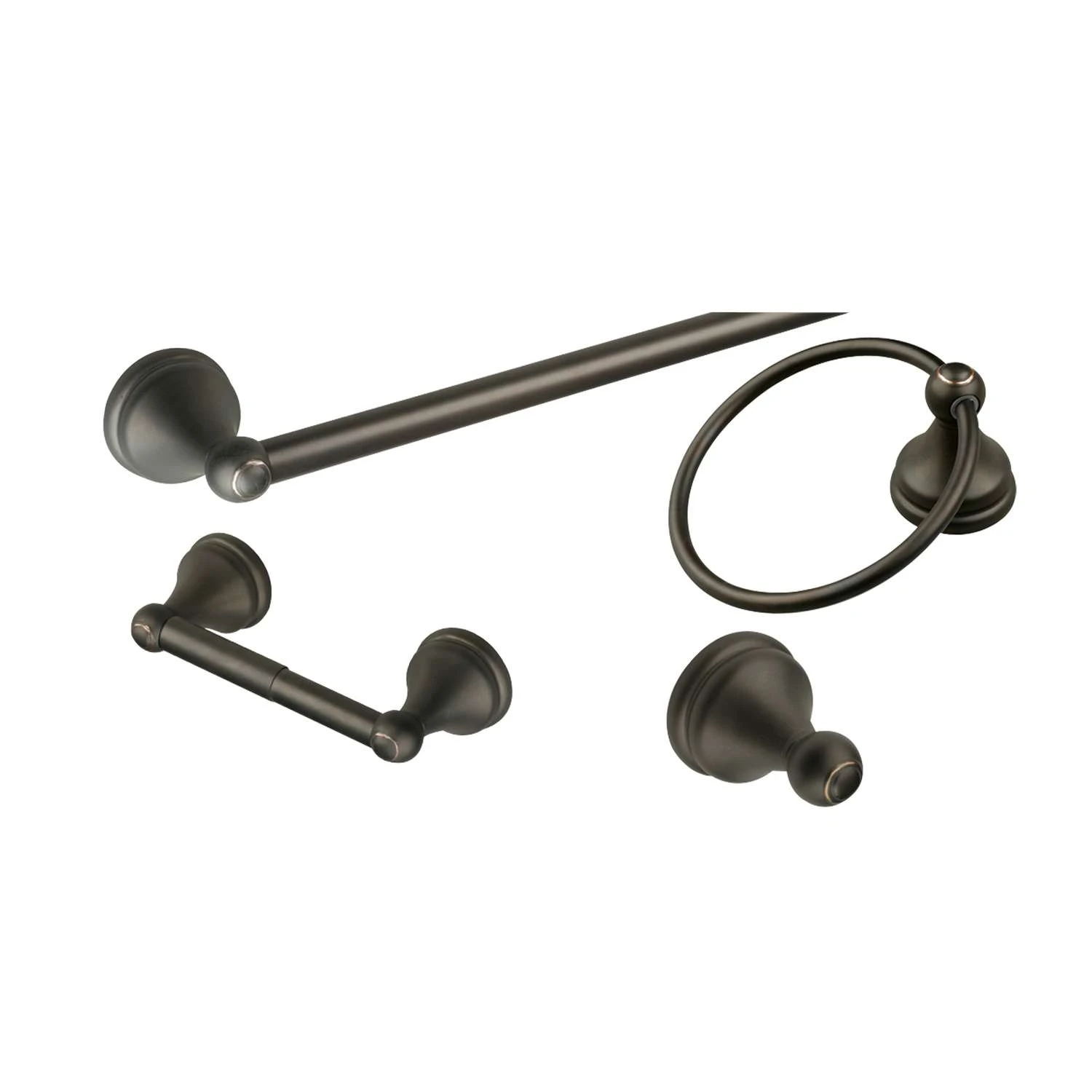 Enhance your decor with the allante 4 piece bathroom accessories collection. Includes a 24 inch towel bar, a 6 inch towel ring, a toilet tissue holder and a robe hook. Each item comes with hardware that is concealed after installation is complete. Collection offers an attractive satin nickel finish to accent many decor, great choice to complete any bath or powder room. Design house offers products in multiple home decor categories including lighting, ceiling fans, hardware and plumbing products and is devoted to providing quality products across the home decor spectrum. Attractive oil rubbed bronze finish. 4 piece accessory kit that includes a 24 in. towel bar, towel ring, toilet tissue holder and robe hook. Zinc, steel and aluminum construction. Wall mounted design.